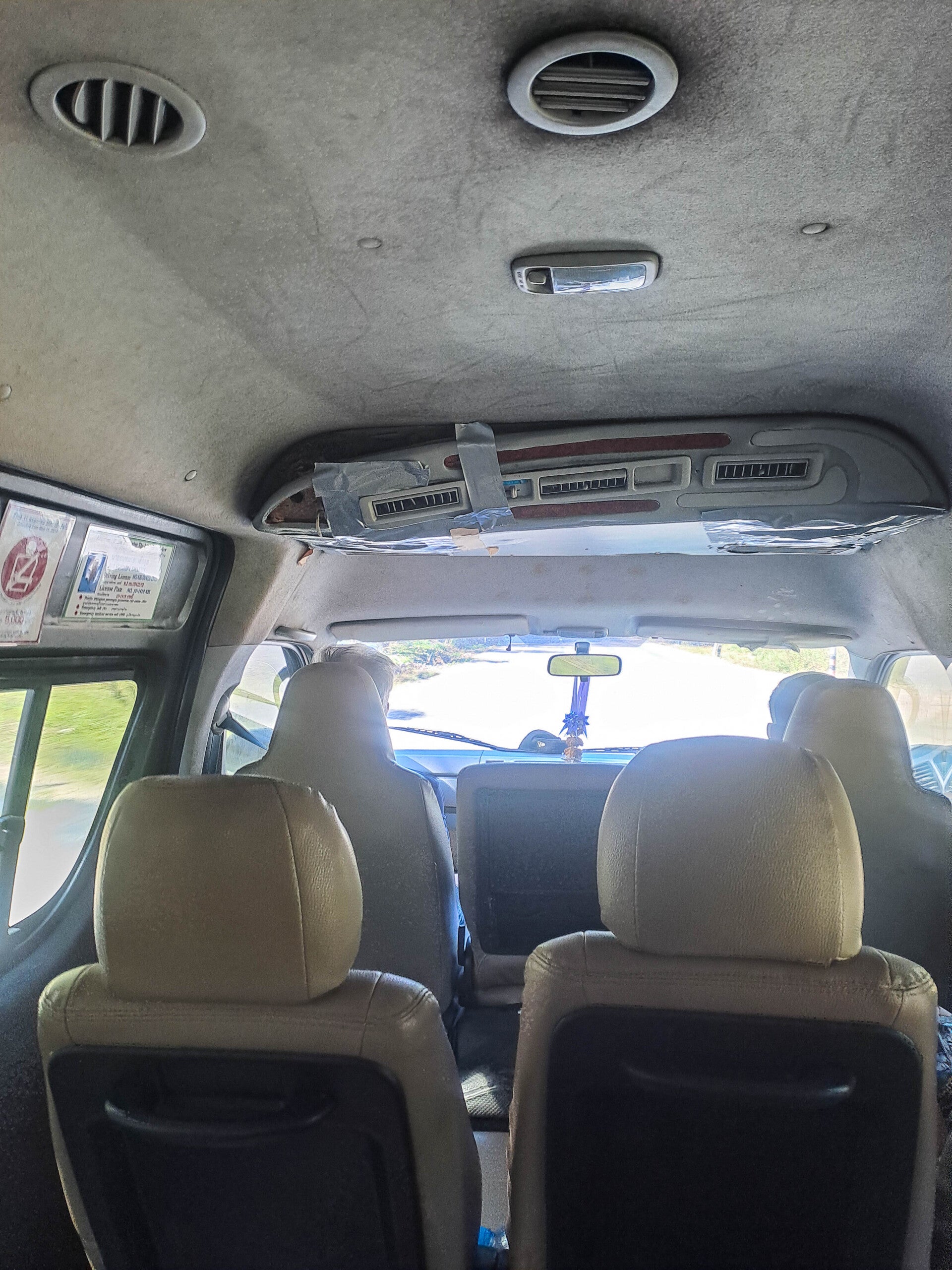 À l'embranchement pour Phang Nga notre minivan s'arrête et nous dit qu'on attend d'autres passagers. En fait ça sera un échange de passagers, nous sommes transférés sur un autre minivan -dont l'état est nettement moins bon que le 1er- qui roule directement sur Phang Nga.
