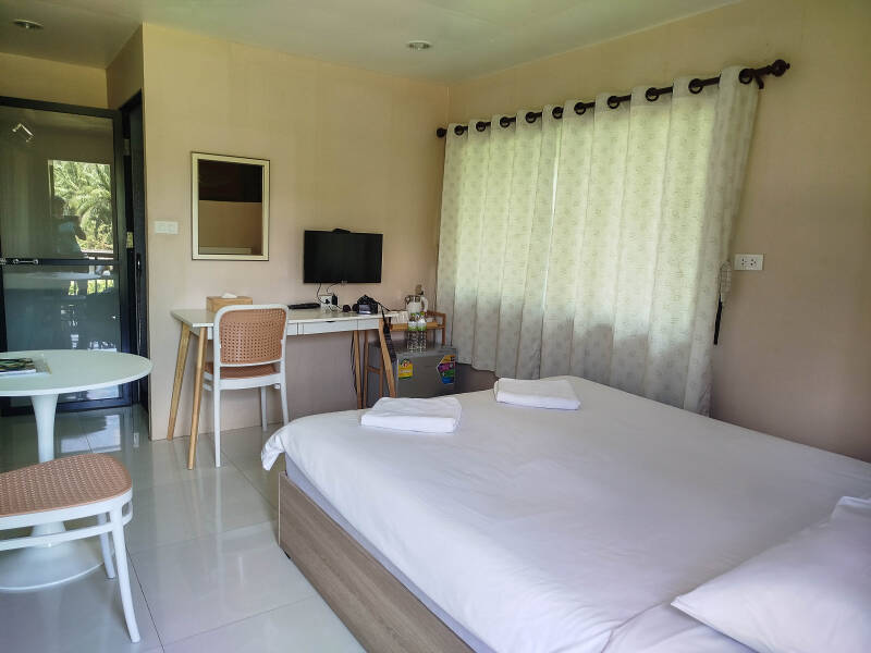 De retour à la guesthouse la chambre est prête et nous pouvons nous installer. Le bungalow est petit mais très propre. Il dispose d'une petite terrasse avec vue sur les champs, un atout selon nous.