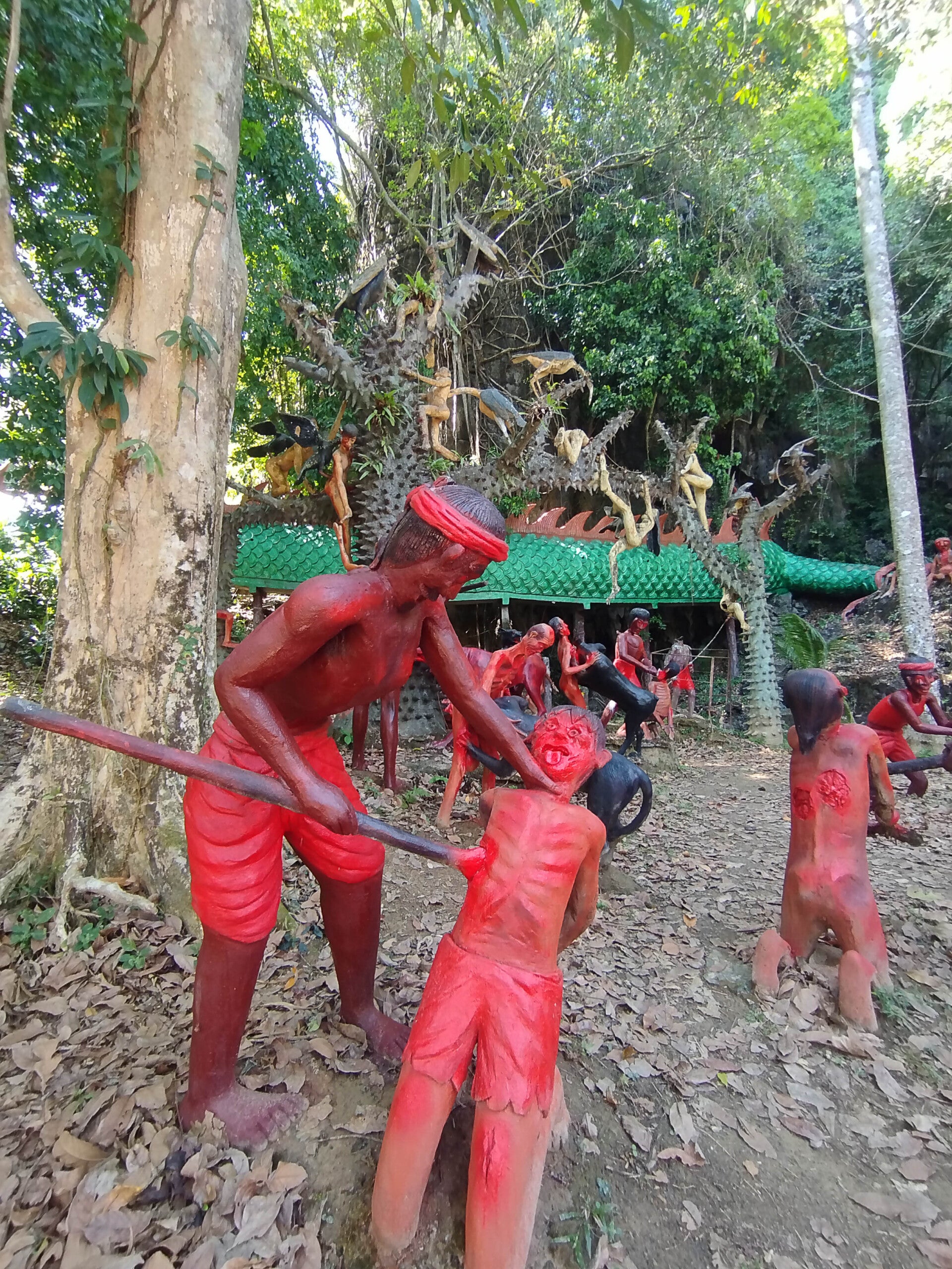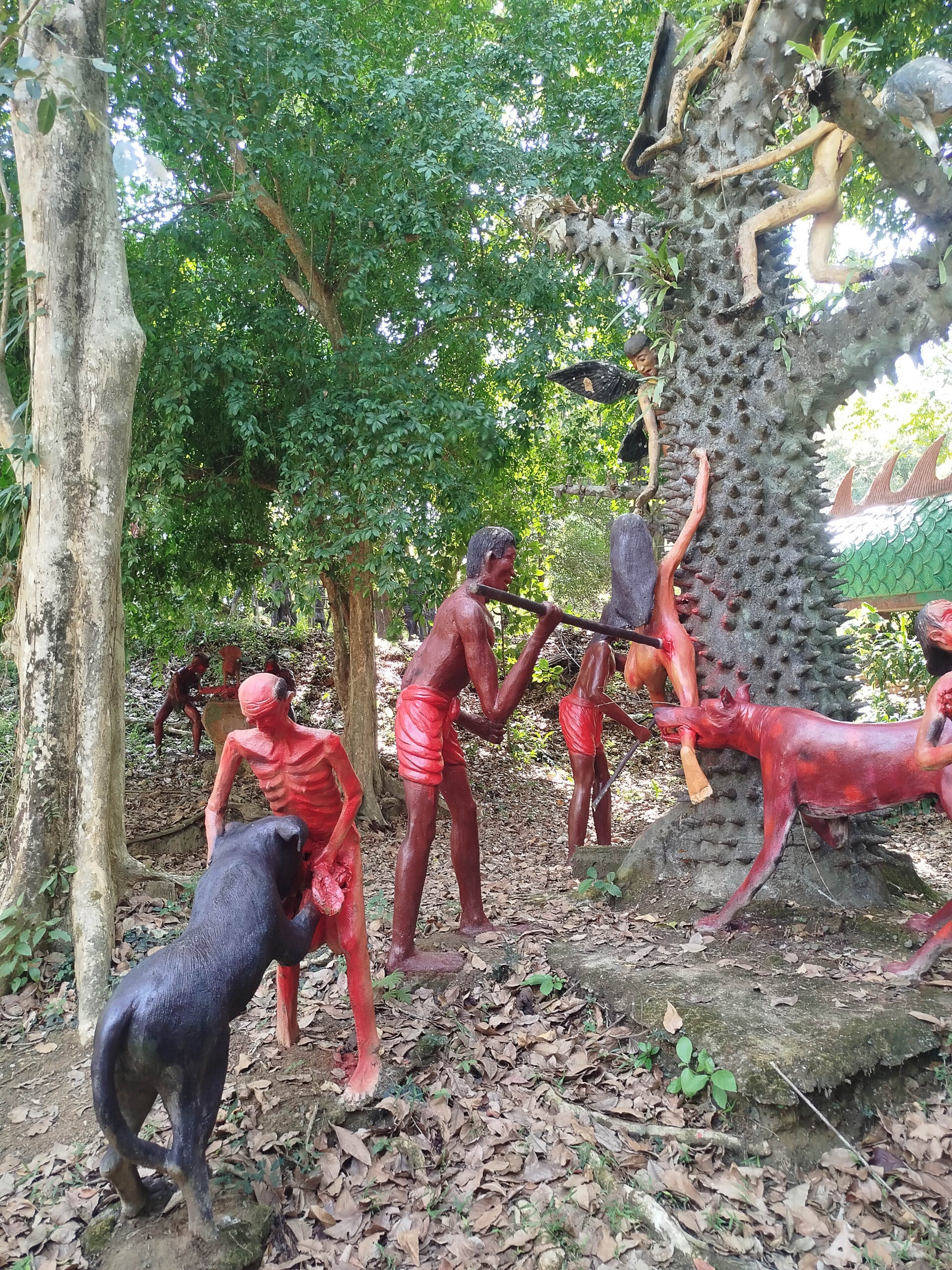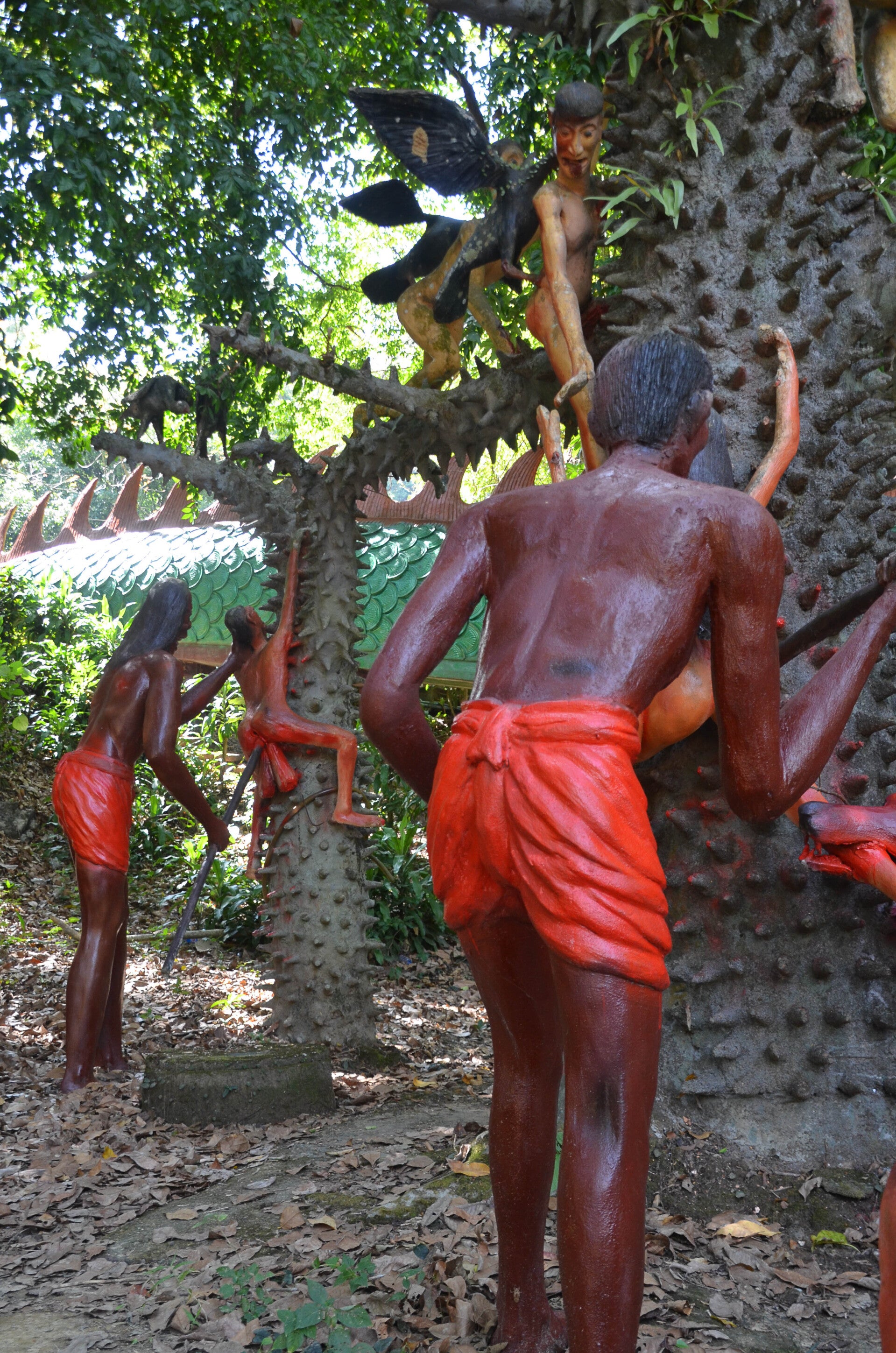 Revenant sur nos pas, nous descendons le petit escalier menant à une esplanade où se regroupent d'effrayantes statues. C'est une véritable vision de l'enfer bouddhique.