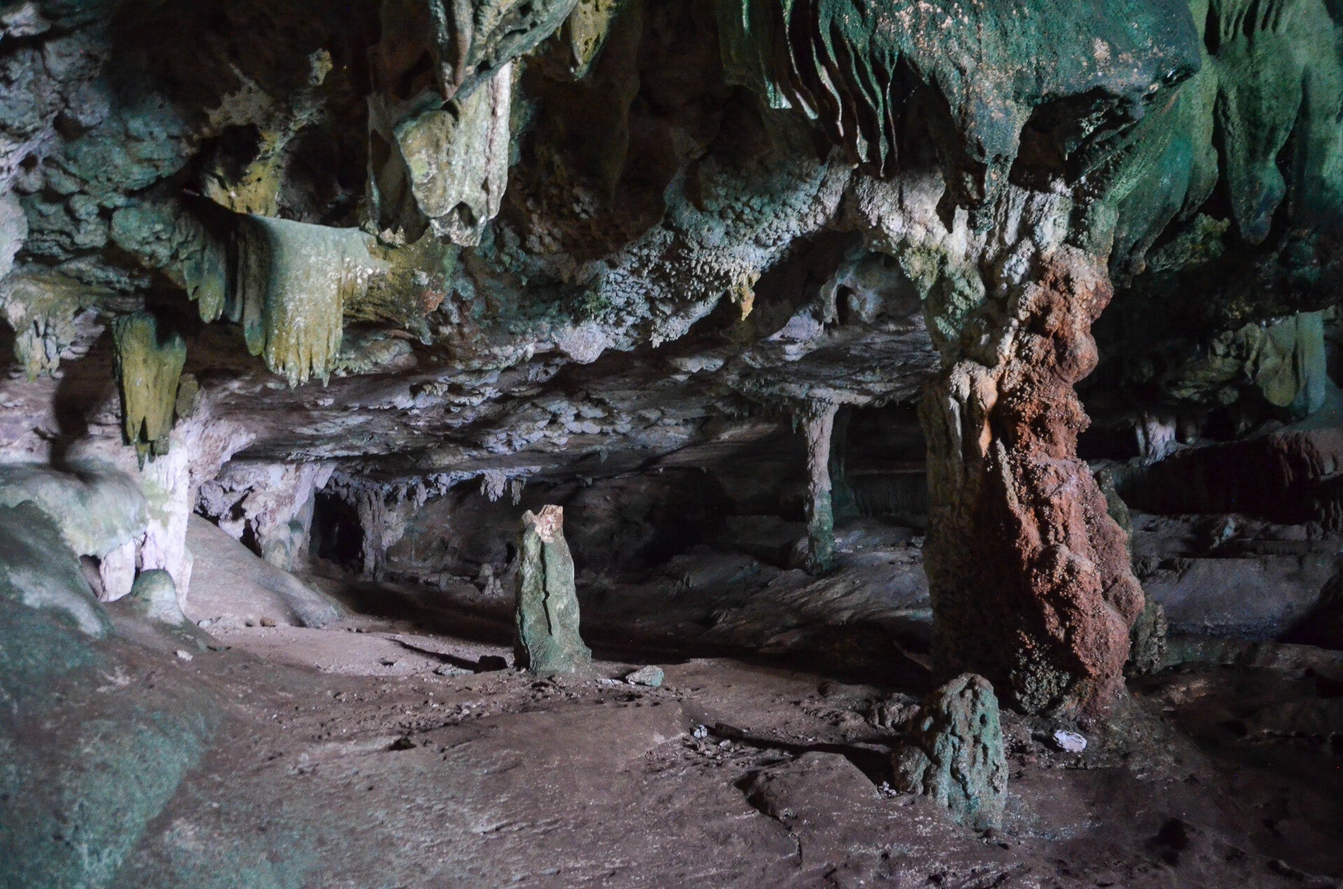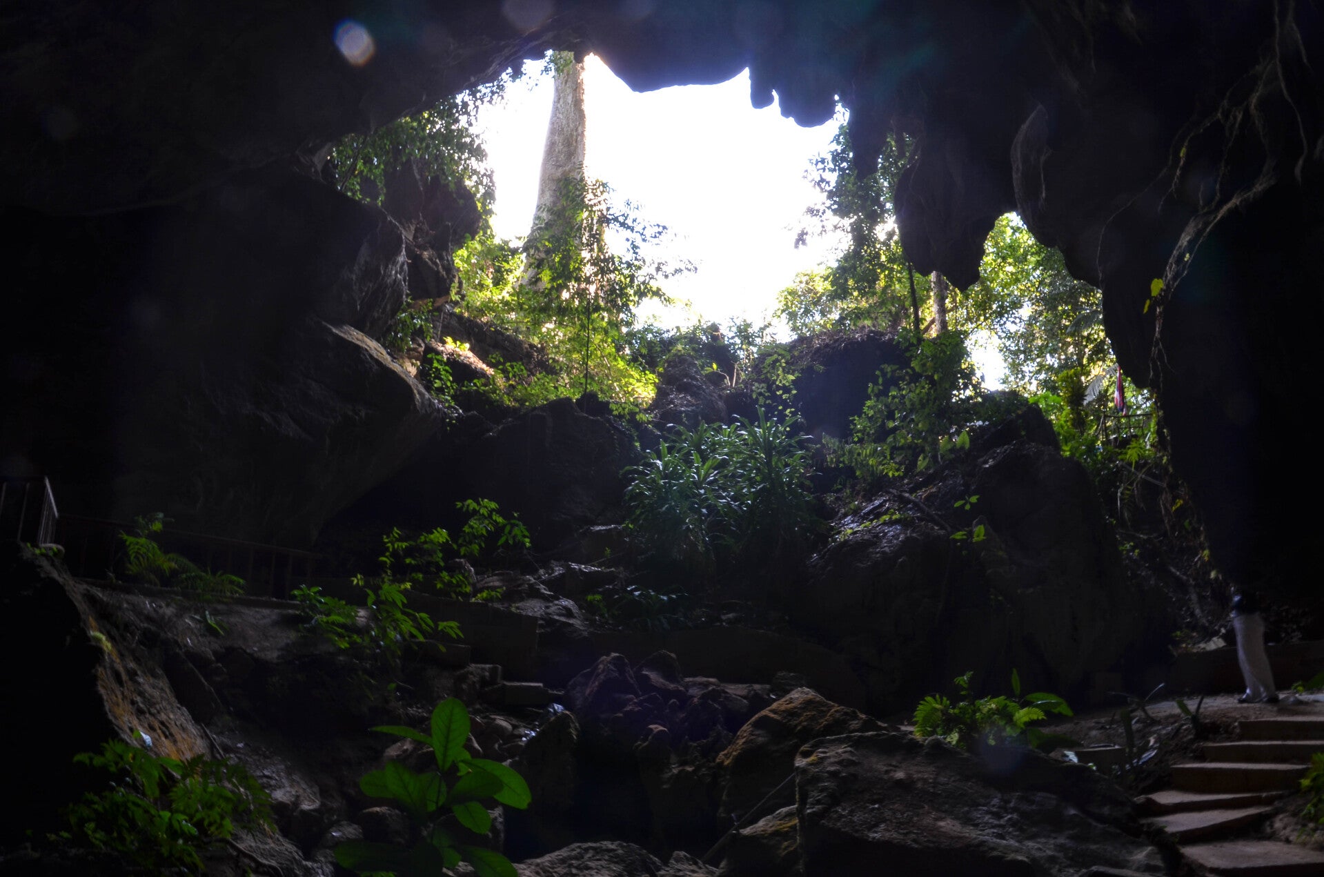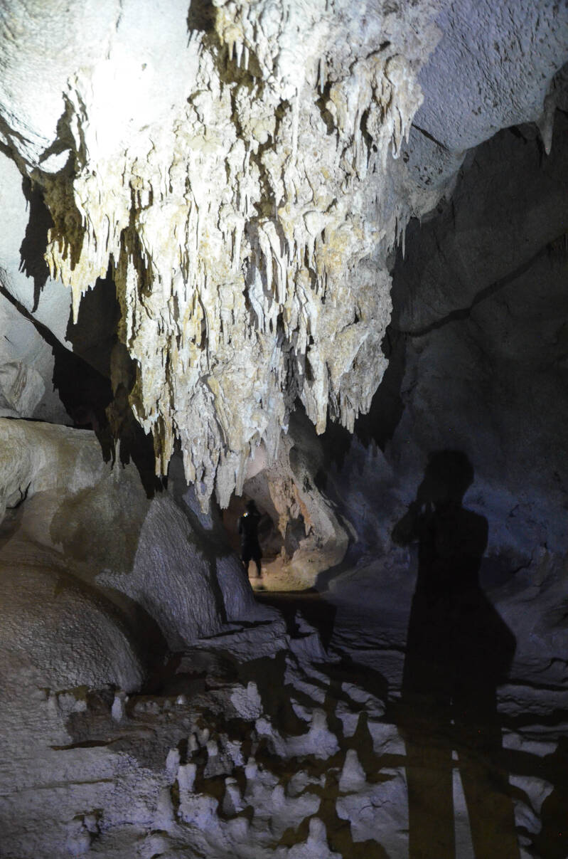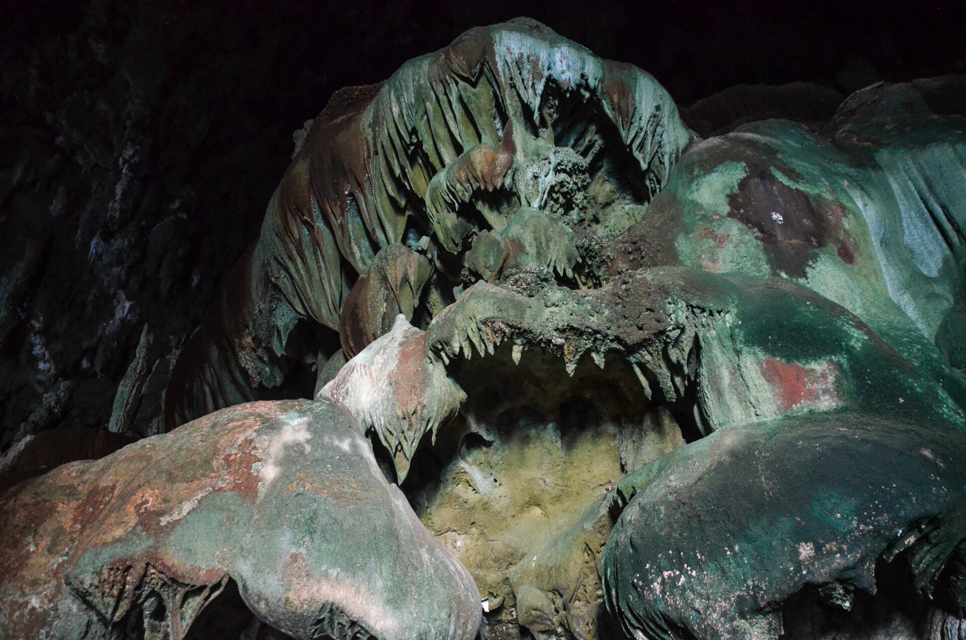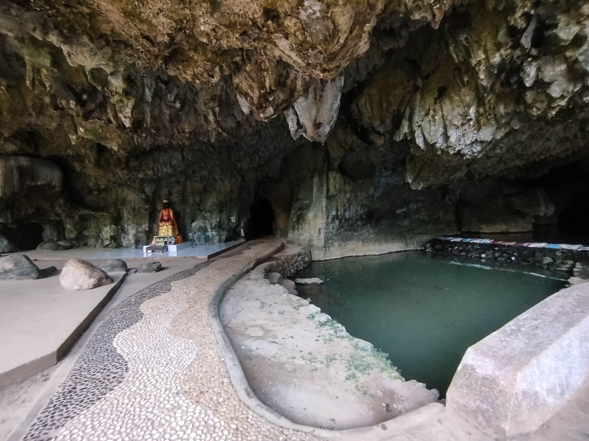 Cette grotte est réputée pour ses impressionnantes stalactites et stalagmites. À l'entrée, un sanctuaire sombre se trouve sous un affleurement rocheux.