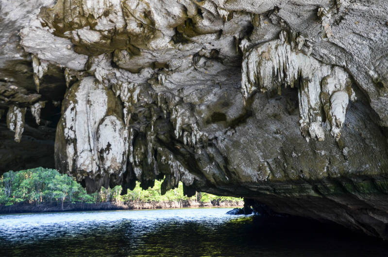 Plus loin, la rivière souterraine s'enfonce dans la grotte. J'avais lu qu'il est possible de s'y aventurer en kayak, mais aucune embarcation n'est visible et il n'y a personne sur place. On se contentera de l'entrée.