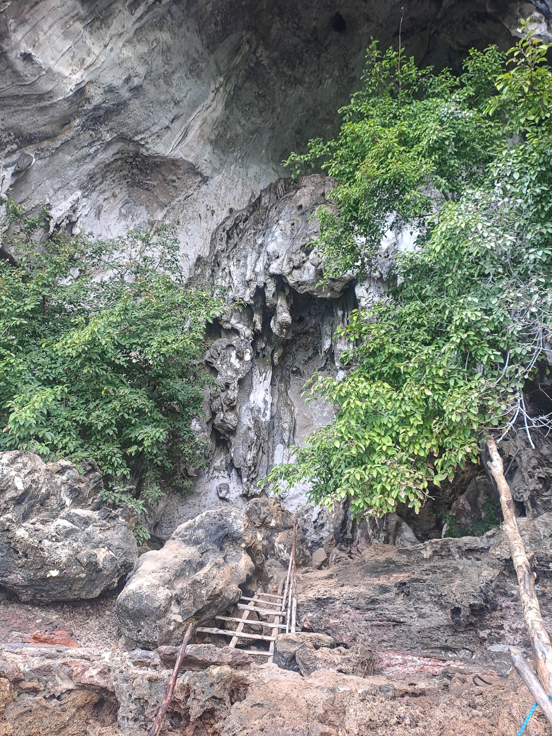 Nous sommes déposés au pied d'une grotte dont l'accès est un peu sportif. Nous sommes seuls, aucun autre bateau à l'horizon. Ici encore de magnifiques formations rocheuses. Les couleurs sont incroyables, tout comme la taille de la grotte.