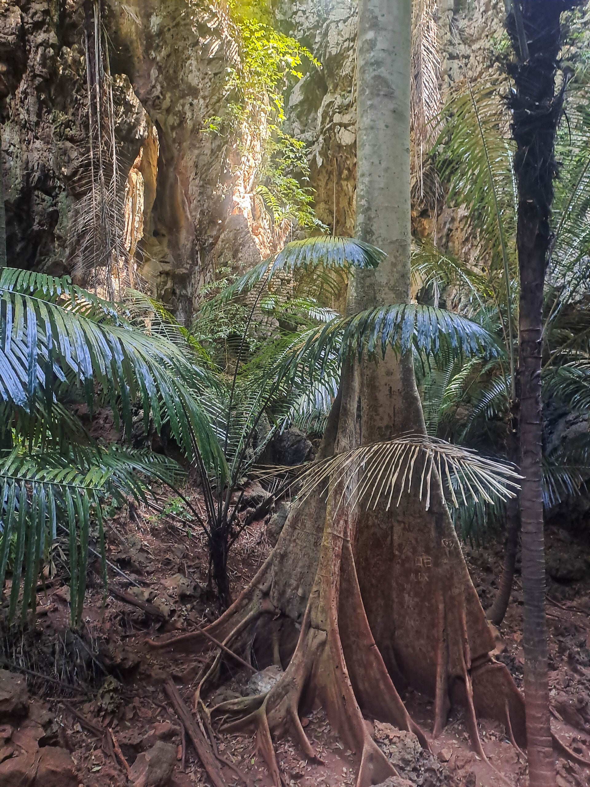 Prochaine étape : le lagon caché. Depuis le point de vue, nous traversons une portion de forêt relativement accessible avant d’attaquer une descente très raide. La corde est indispensable ; on progresse presque en rappel. Le cadre est superbe et l’on aperçoit enfin le lagon, un peu sombre à cette heure. Pour s’y baigner, il faudrait encore descendre 2 parois rocheuses. Nous préférons renoncer.