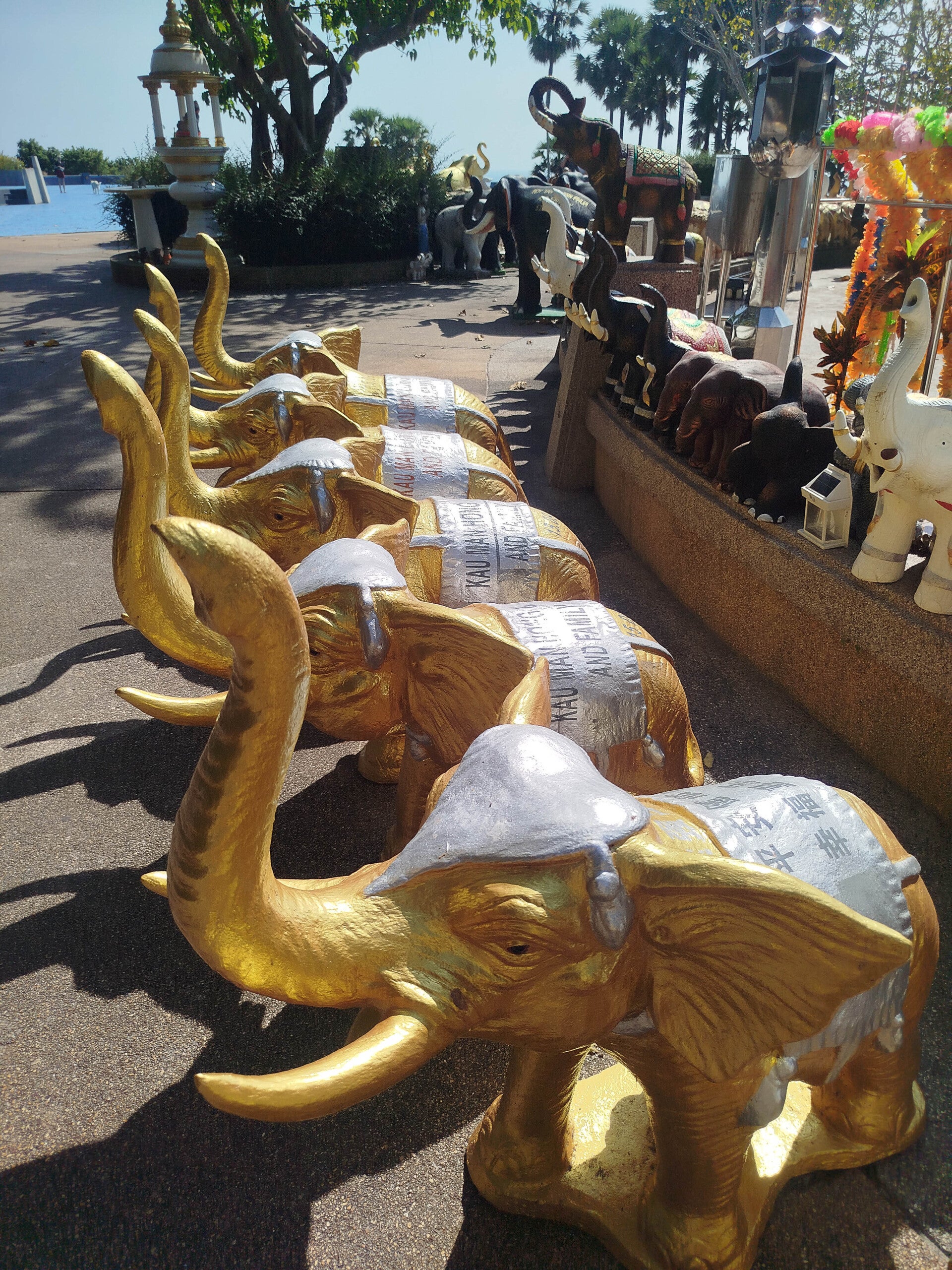 À l'arrière, un joli temple hindou, lieu de culte aux éléphants.